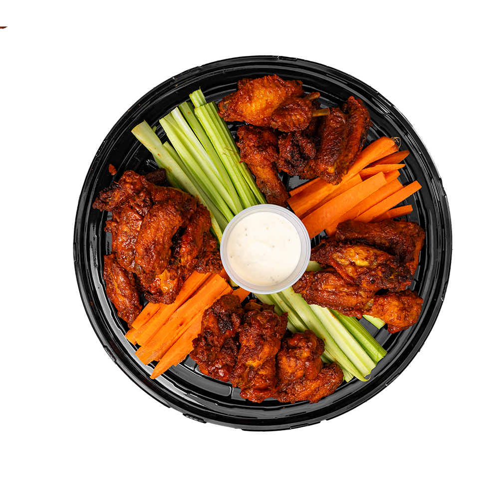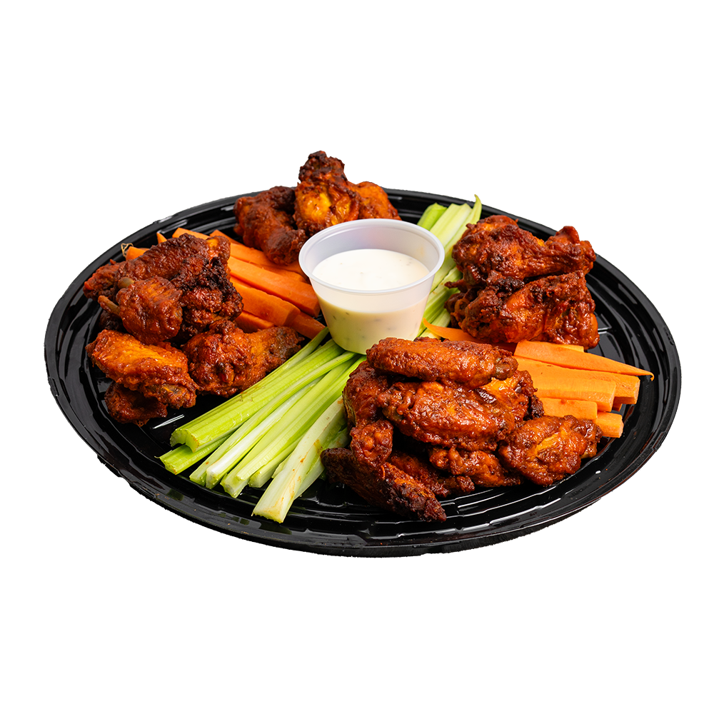 Deliciosas alitas de pollo, bañadas en salsa picosa acompañada de tiritas de zanahoria, apio y aderezo de la casa.