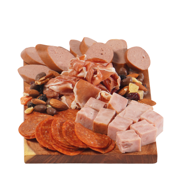 Embutidos importados, jamón serrano, salchicha campestre, pepperoni, jamón ahumado, acompañado de mix de nueces y pasas con chocolate.