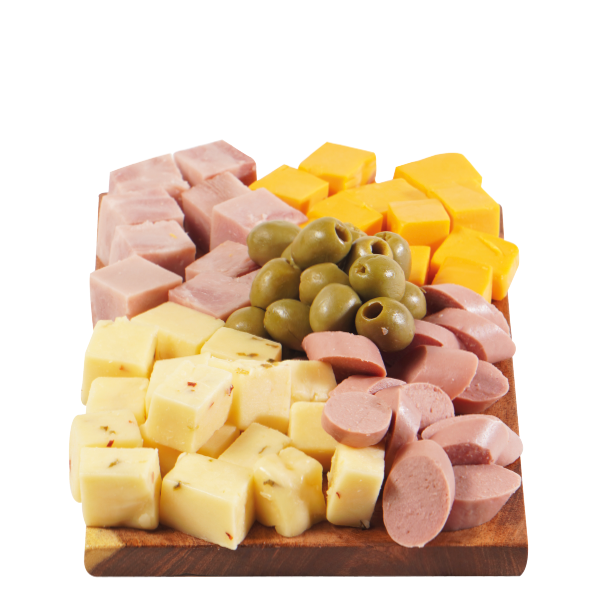 Carnes frías, salchicha de pavo, queso con jalapeño, queso cheddar, jamón ahumado. acompañado de aceitunas.