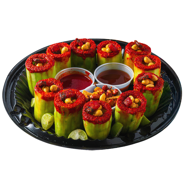 Charola de short de pepino escarchados de Tajín, acompañados de cacahuate Japonés, clamato preparado, chamoy de la casa, cacahuate mix norteño con carne seca y limones.