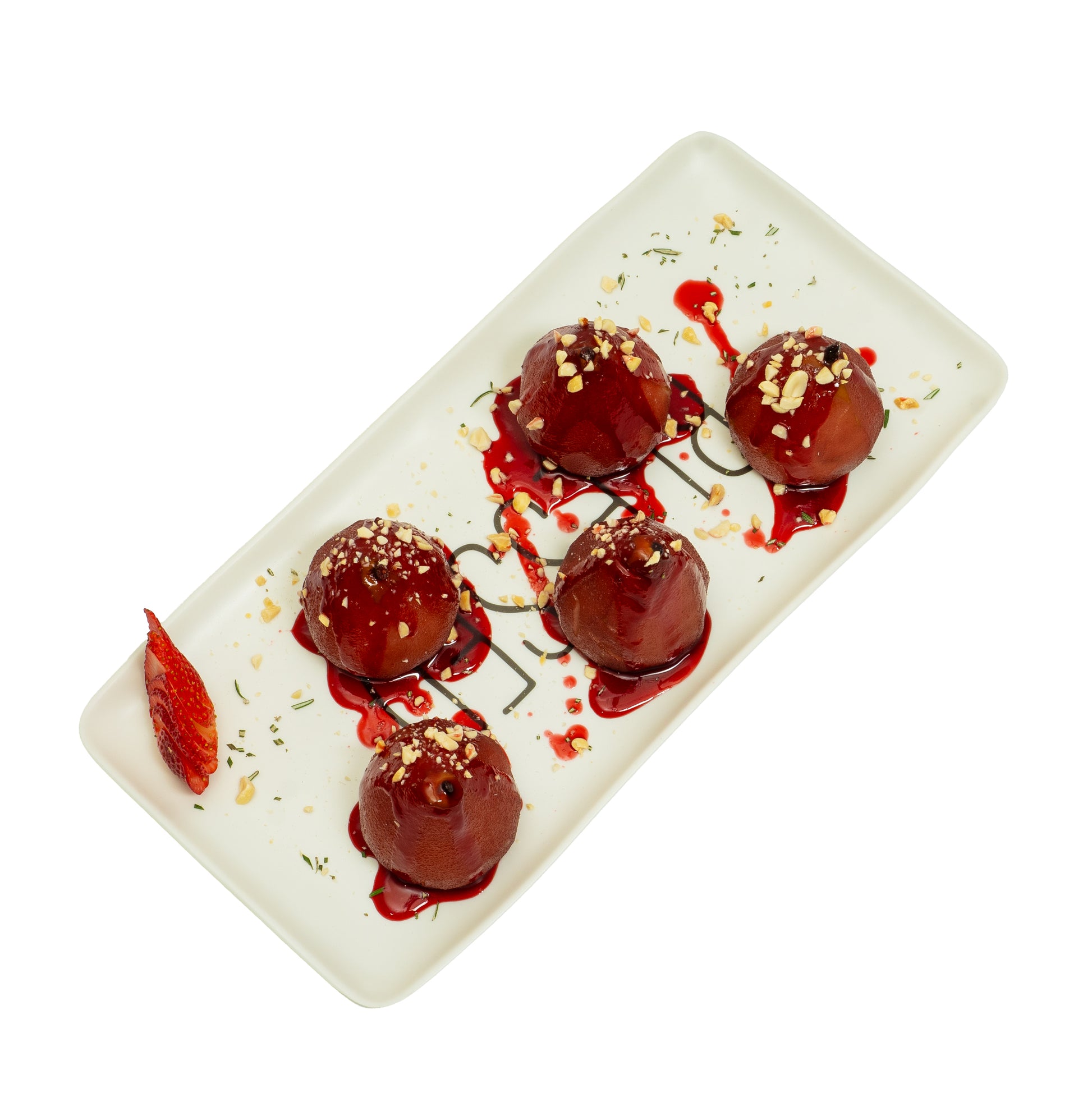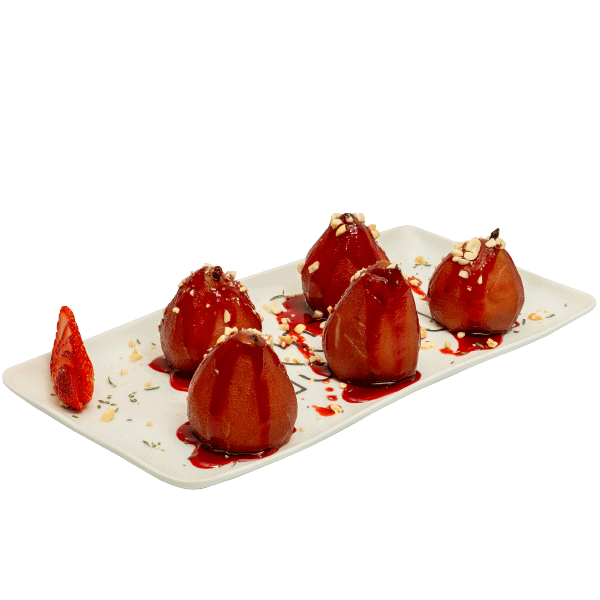 Peras caramelizadas en vino tinto y especies. Acompañado de una reducción de vino tinto.
